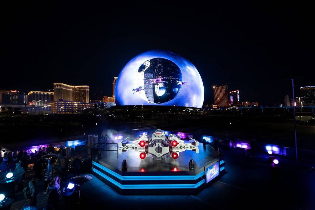 En una primicia mundial para la pantalla gigante, la experiencia fue totalmente interactiva. Los aficionados, entre los que se encontraba Jaxson Dart, quarterback de los New York Giants, se metieron en una cabina física de Ala-X de LEGO en el suelo para jugar a la legendaria «Carrera de trincheras». Mientras pilotaban sus naves, la acción se desarrollaba en directo a través de la enorme pantalla. Todo culminó con el objetivo final: volar la Estrella de la Muerte sobre el Strip de Las Vegas.